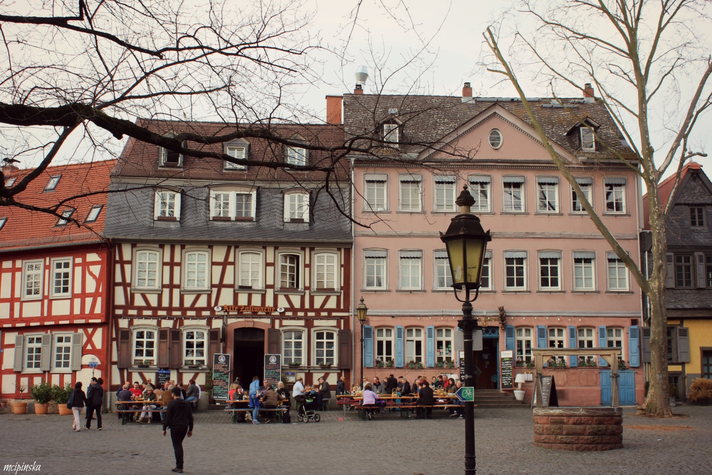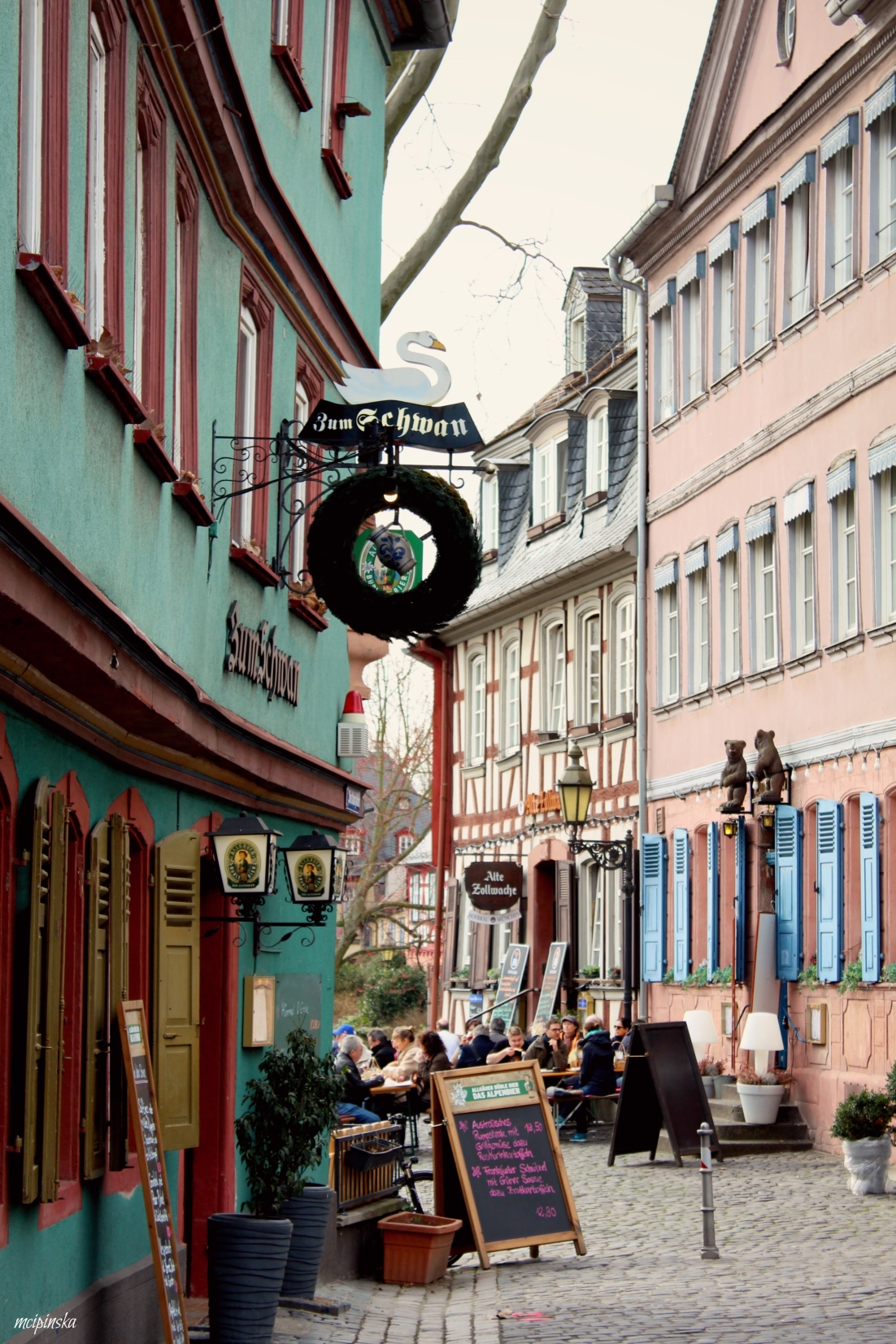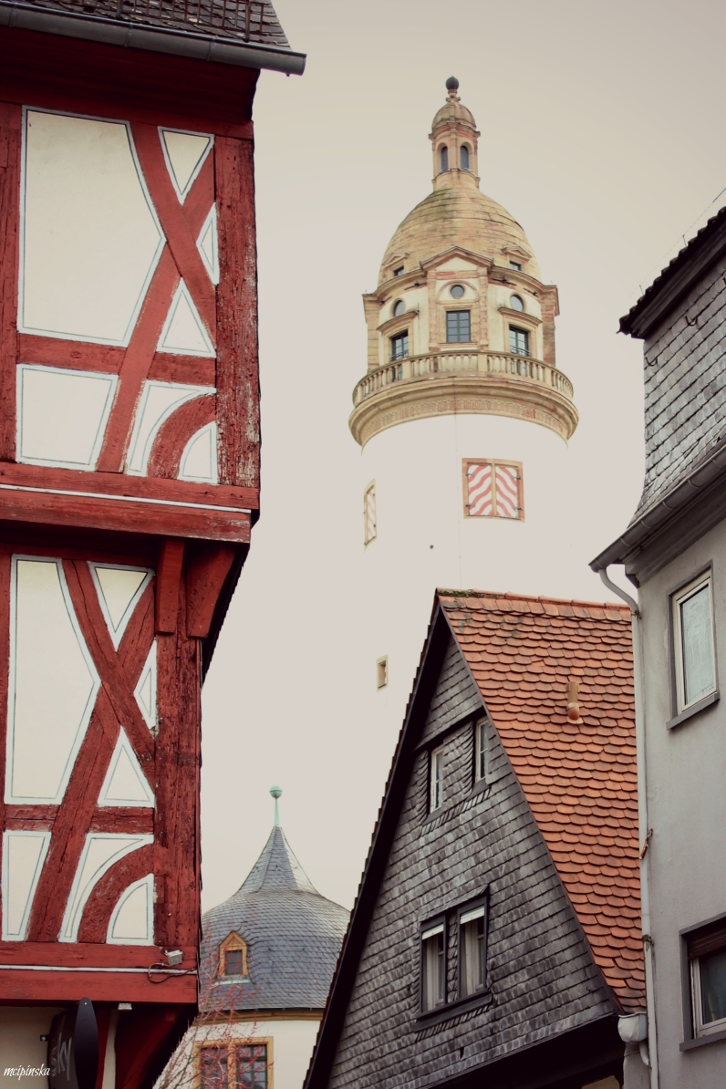 My main impression is that it is a place of contrasts. It is part of Frankfurt metropolis, but remains peaceful and keeps its own small town identity. The medieval character of the city is mixed with modern industry. On the streets of old town with timber-framed houses, fancy and expensive cars are parked. Beautiful landscape with a river is crossed by the highway. Skyscrapers on the horizon contrast nicely with green trees of the park.