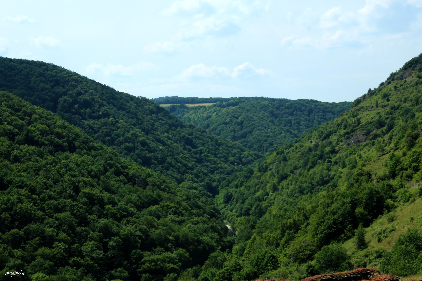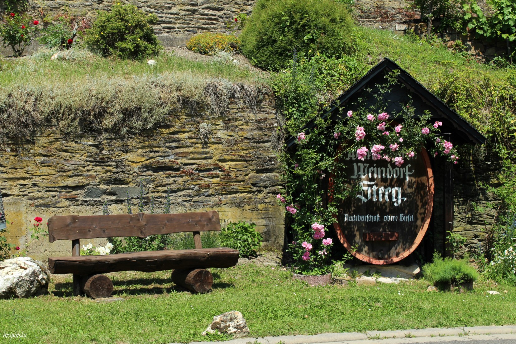The first part of a trail leads through the forest and goes to the next village – Steeg, which is nicely located in a valley. Already from here you can see how the trail path leads at the opposite site of the mountain and people walking there. Green forests and wine yards surround the village with white timber-framed houses. In Steeg you can have a sit by the little donkey-fountain. You can also find a more detailed map with a lot of alternative paths. It is good to compare them and decide on the one you follow, because some of them overlap and it is very easy to get confused. They are marked by different colors and animal type and simply differ in distance.