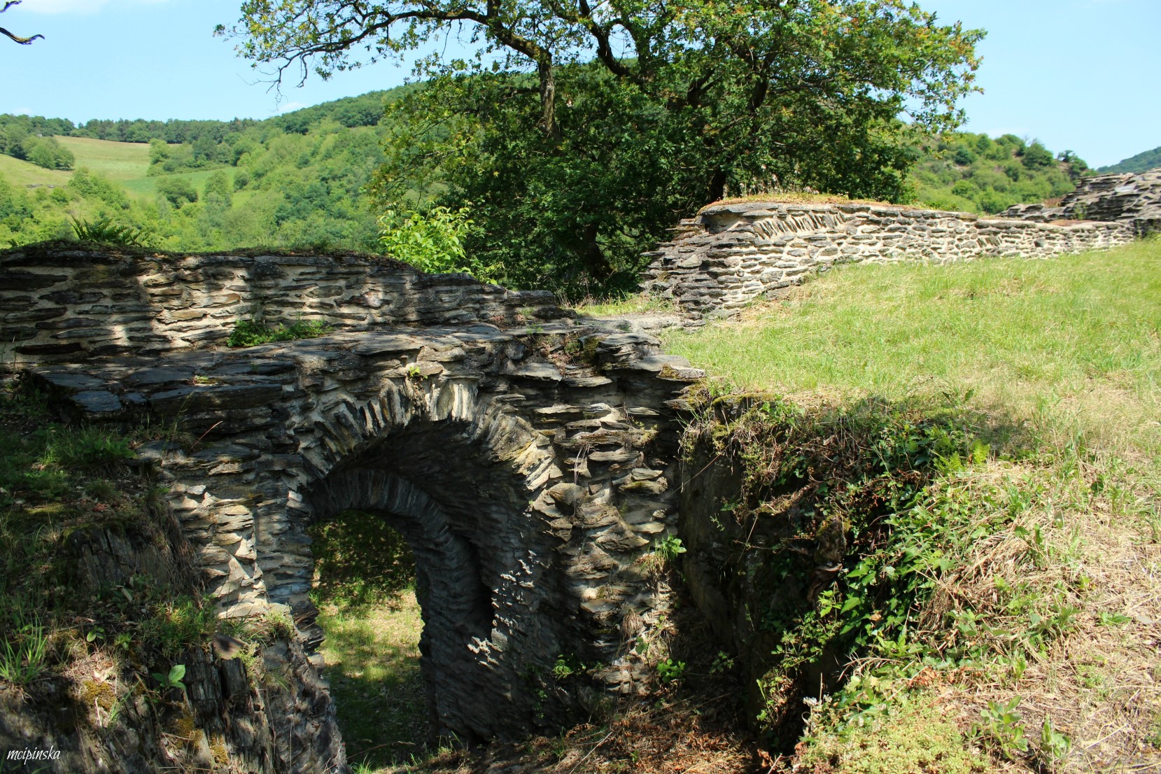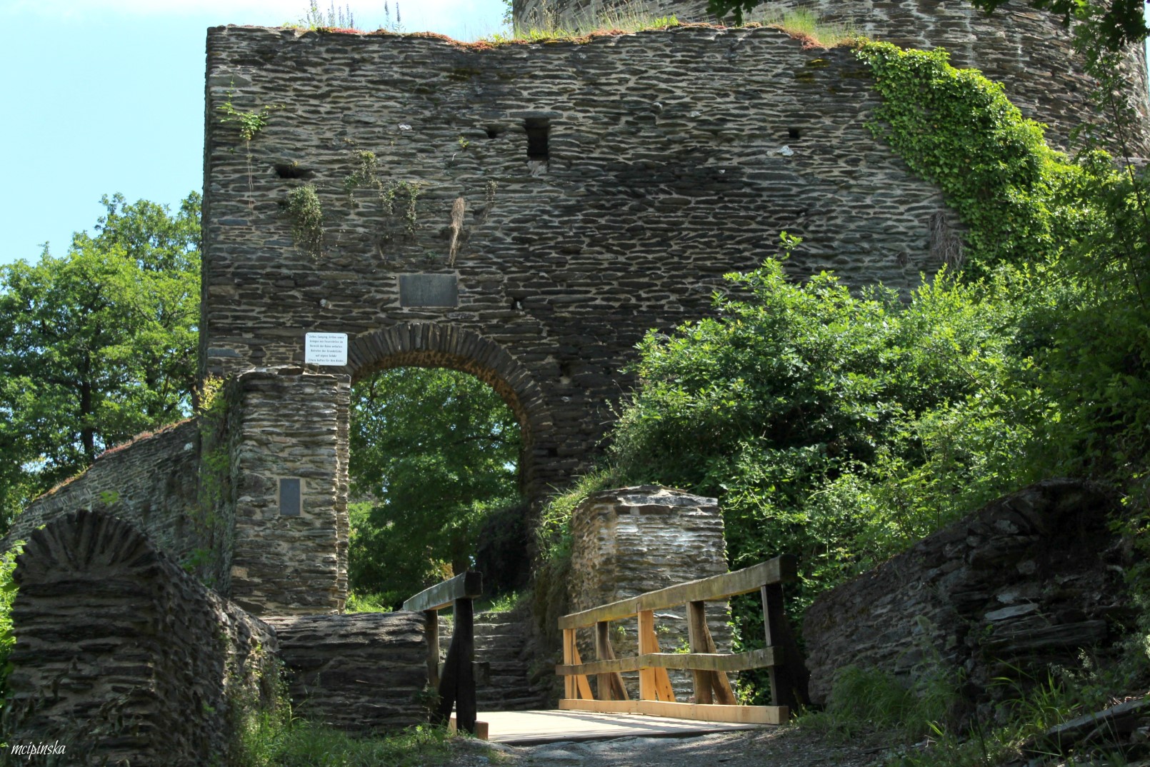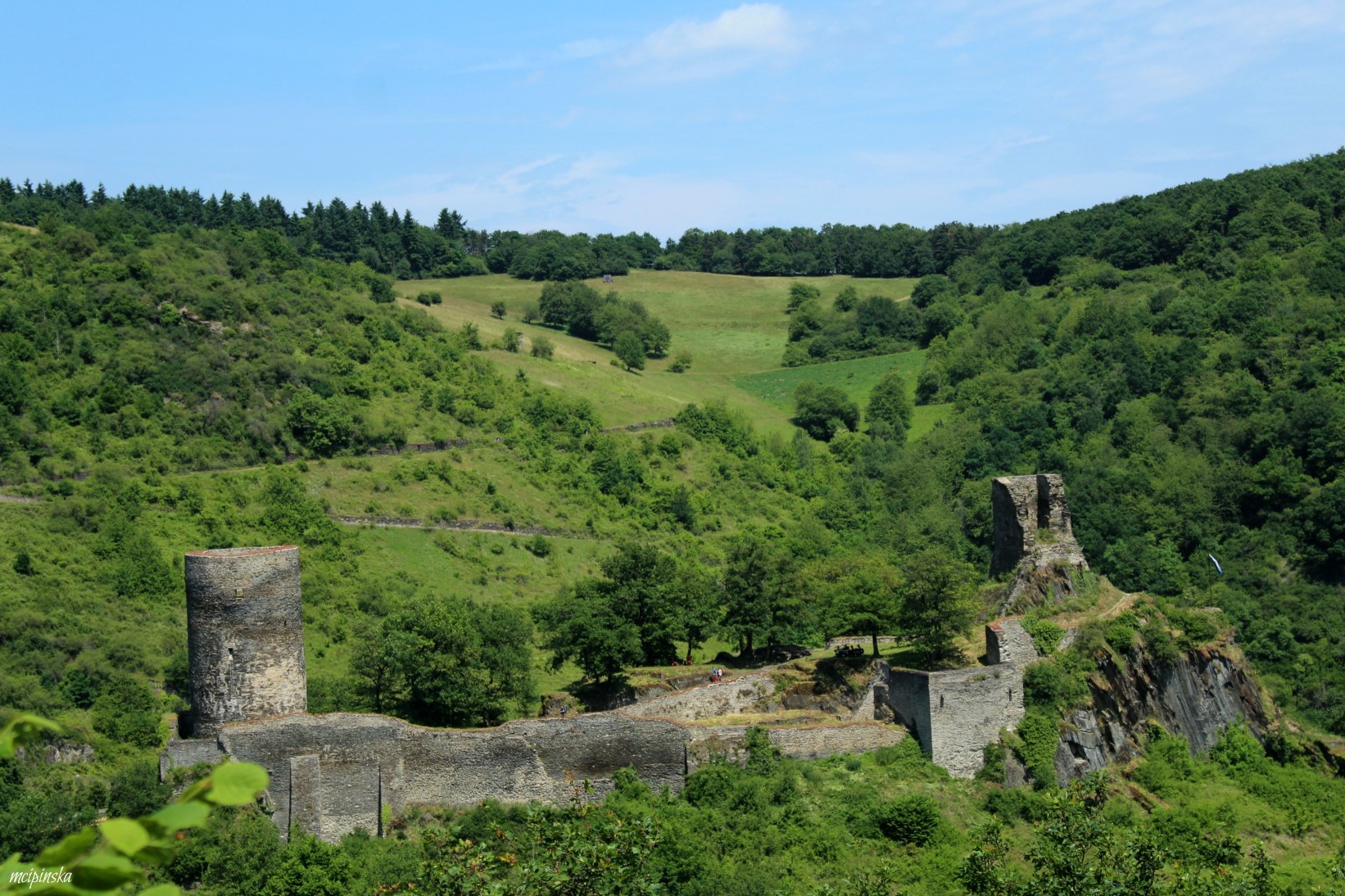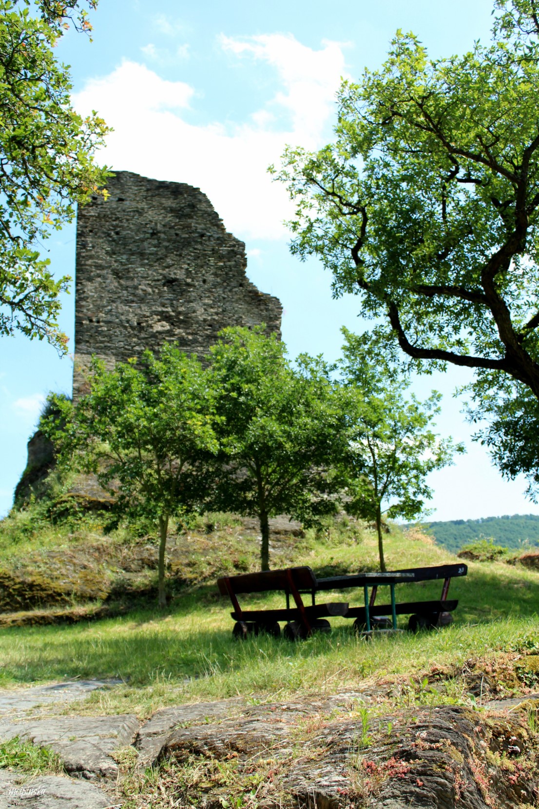 After Steeg you walk around some kind of mountain, and at its other site you have wonderful view to the ruins. Pay attention to your left to see quite scary caves in the walls of the mountain. Stahlberg ruins lay on the hill and are totally covered with grass and trees. It looks a bit sad, like a forgotten place. At the same time it has some fairytale vibe. It is possible to reach those ruins just by car. Parking is just 5 minutes away from the main entrance. To enter the “castle” or its remaining we cross the wooden bridge first. There are still 2 towers left and in between one can find some benches and tables. It is very convenient for a little picnic. The view is very interesting too – from one side green hills, from another little houses in the valley and wine yards around.
