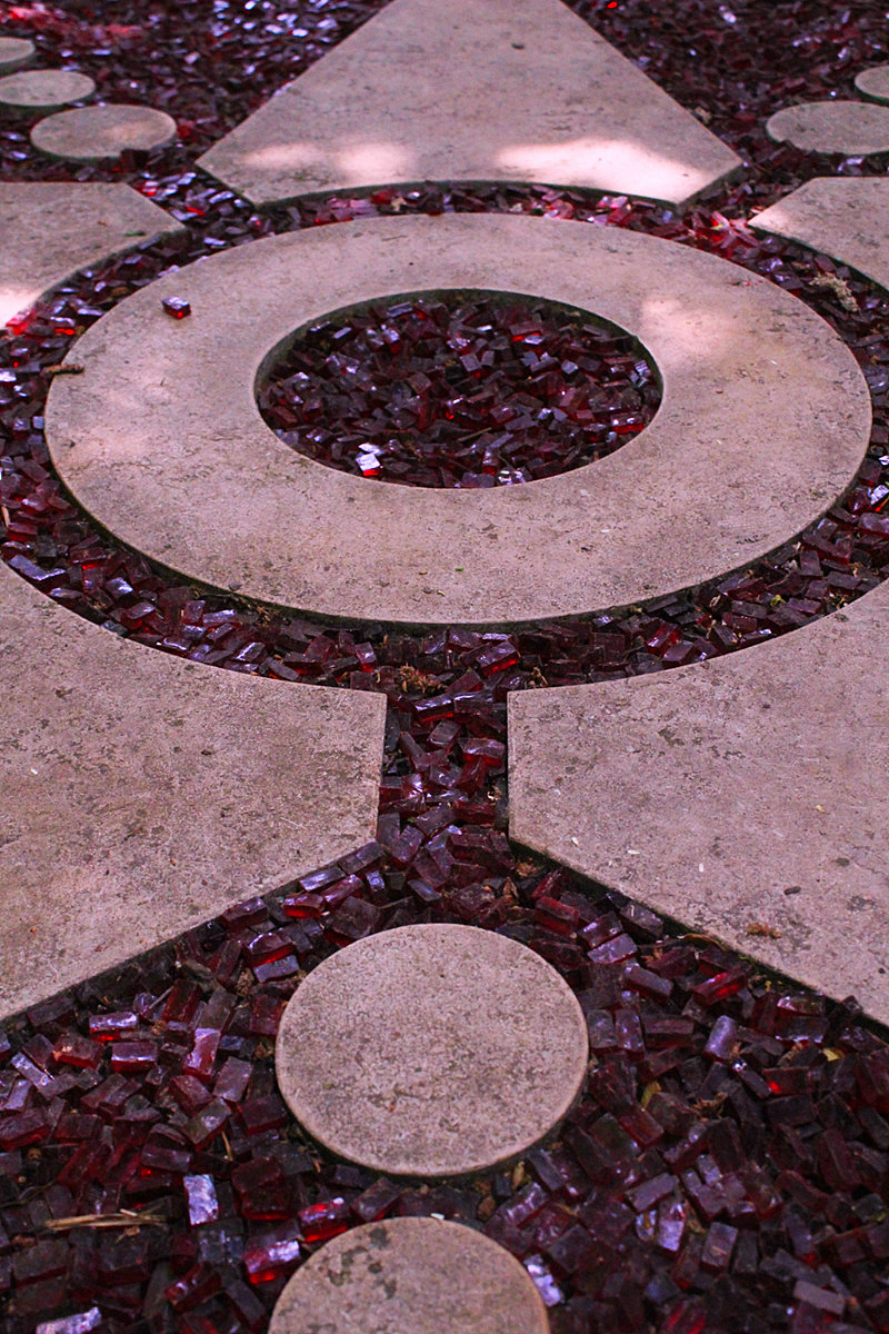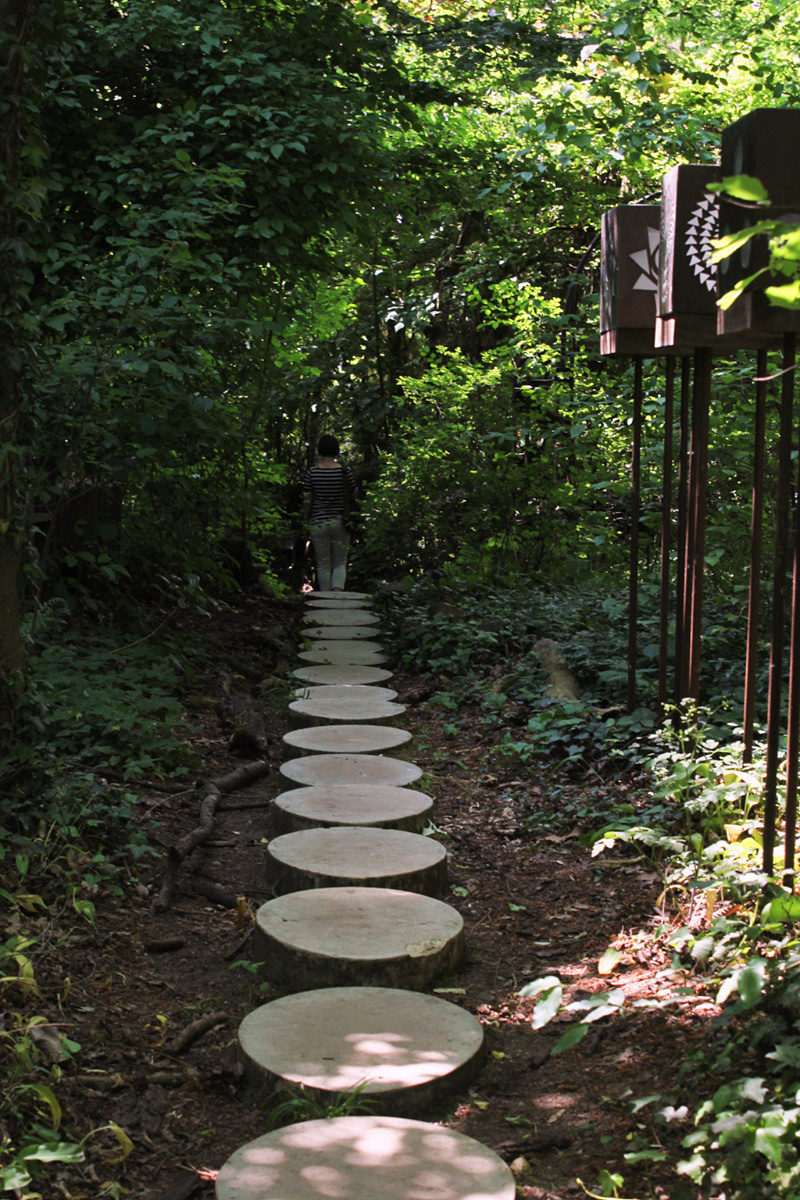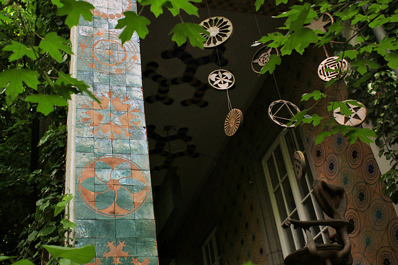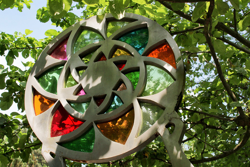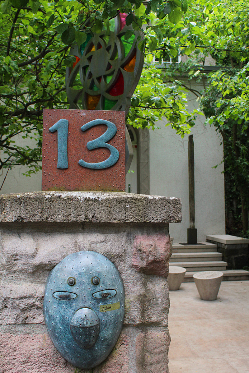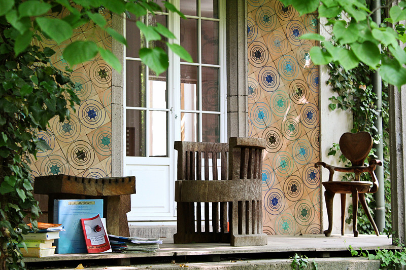 The garden looks a bit neglected. Furniture is old and in a bad condition, plants are growing wild. Not like in beautifully designed nearby garden Rose Hights (Rosenhoehe). Nethertheless, it has plenty of visitors. You follow the egg-shaped stone paths to walk around the garden. There are 108 of them which resembles the radius of a moon – 1080 miles. Everything has some connection to geometry and numerology.