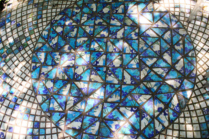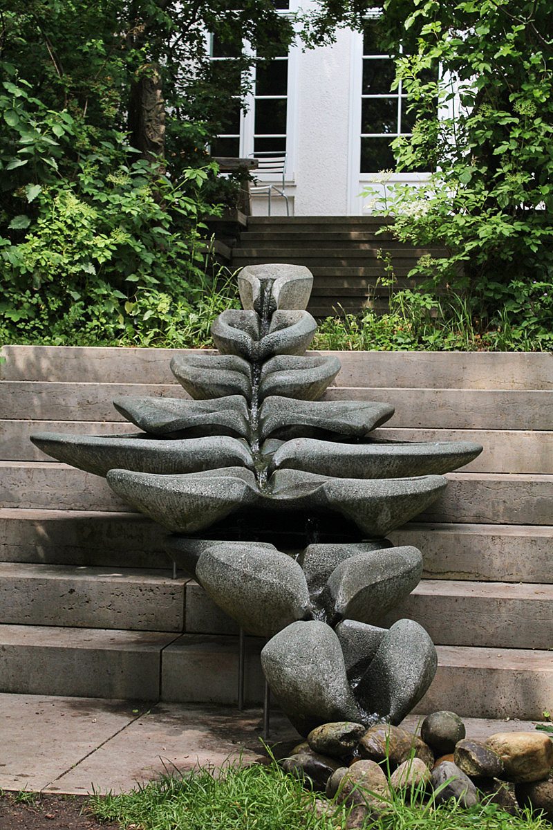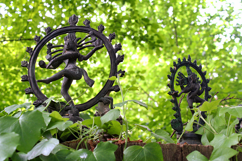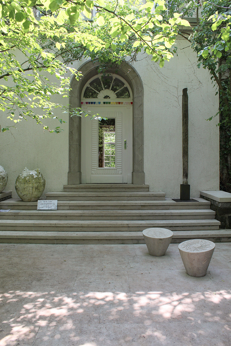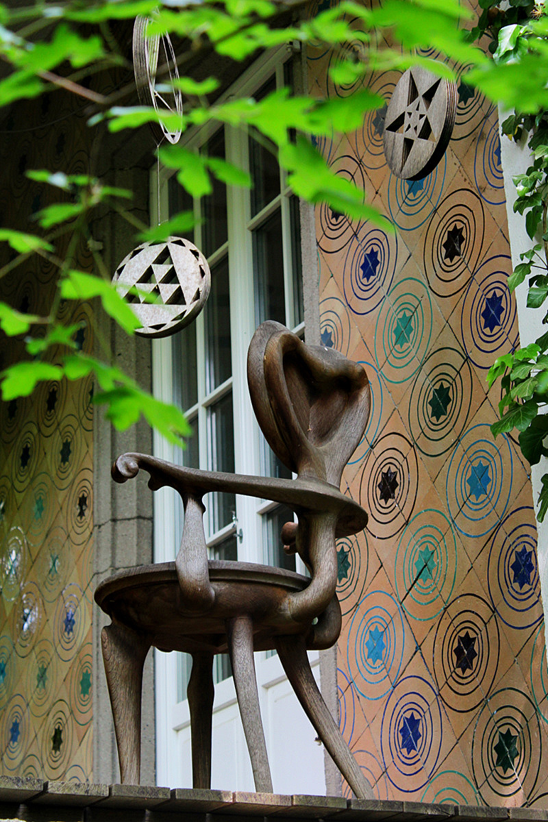 The garden looks a bit neglected. Furniture is old and in a bad condition, plants are growing wild. Not like in beautifully designed nearby garden Rose Hights (Rosenhoehe). Nethertheless, it has plenty of visitors. You follow the egg-shaped stone paths to walk around the garden. There are 108 of them which resembles the radius of a moon – 1080 miles. Everything has some connection to geometry and numerology.