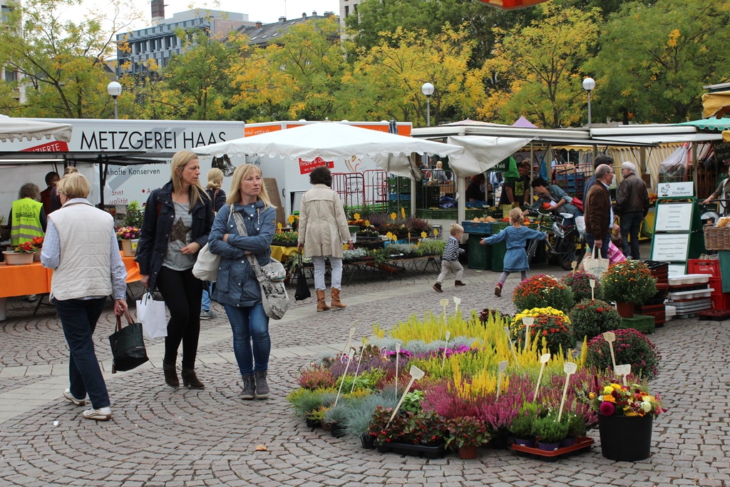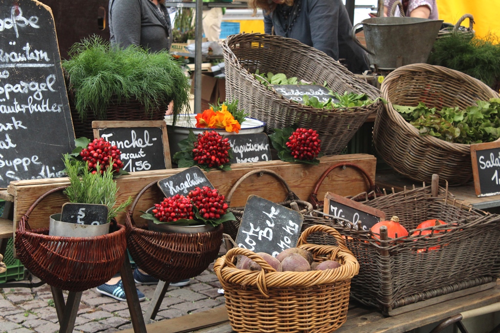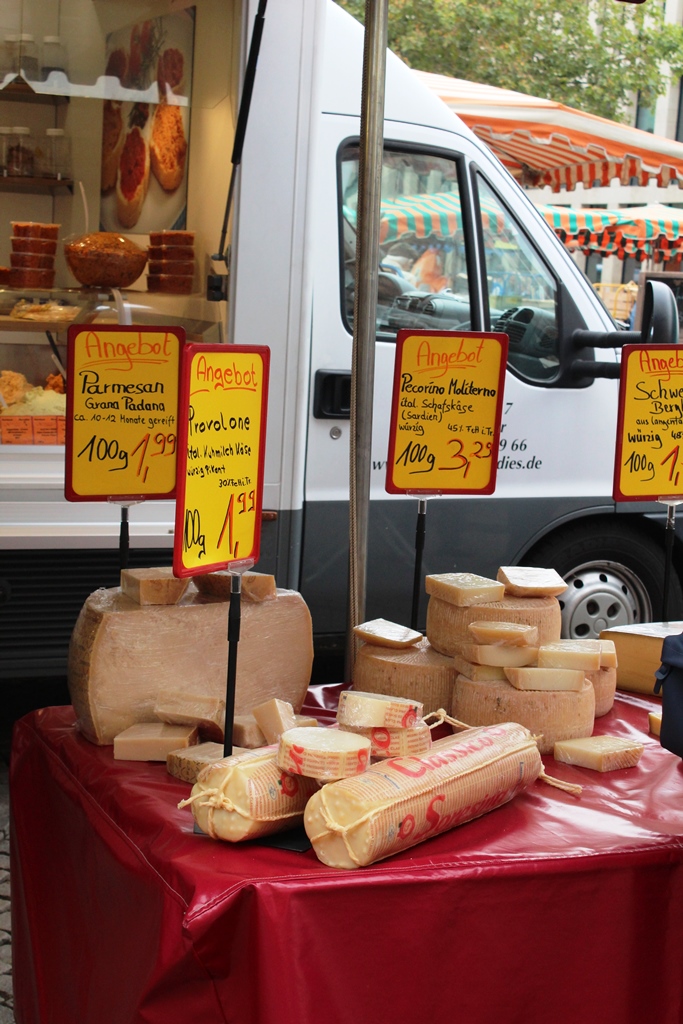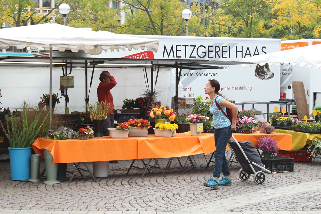 At the Marktplatz in front of the Rathaus, since early morning till lunch time, there is always a farmers’ market opened. The stands are really pretty with colourful umbrellas. You can buy there fresh food: meat, fish, fruit, vegetables. They offer huge variety of cheese, exotic fruit, and local products like wine or honey. There are also seasonal flowers and house decorations. If you get hungry you can always get a warm sausage (curry wurst) and fries. All of it in the rhythms of music played by local artists – violin, cello, accordion.