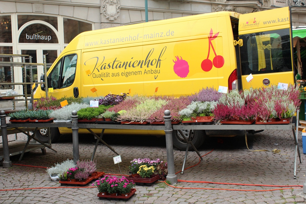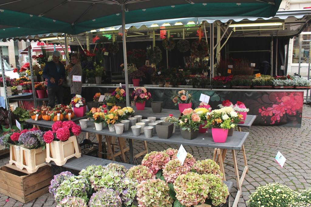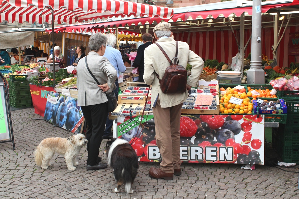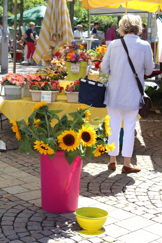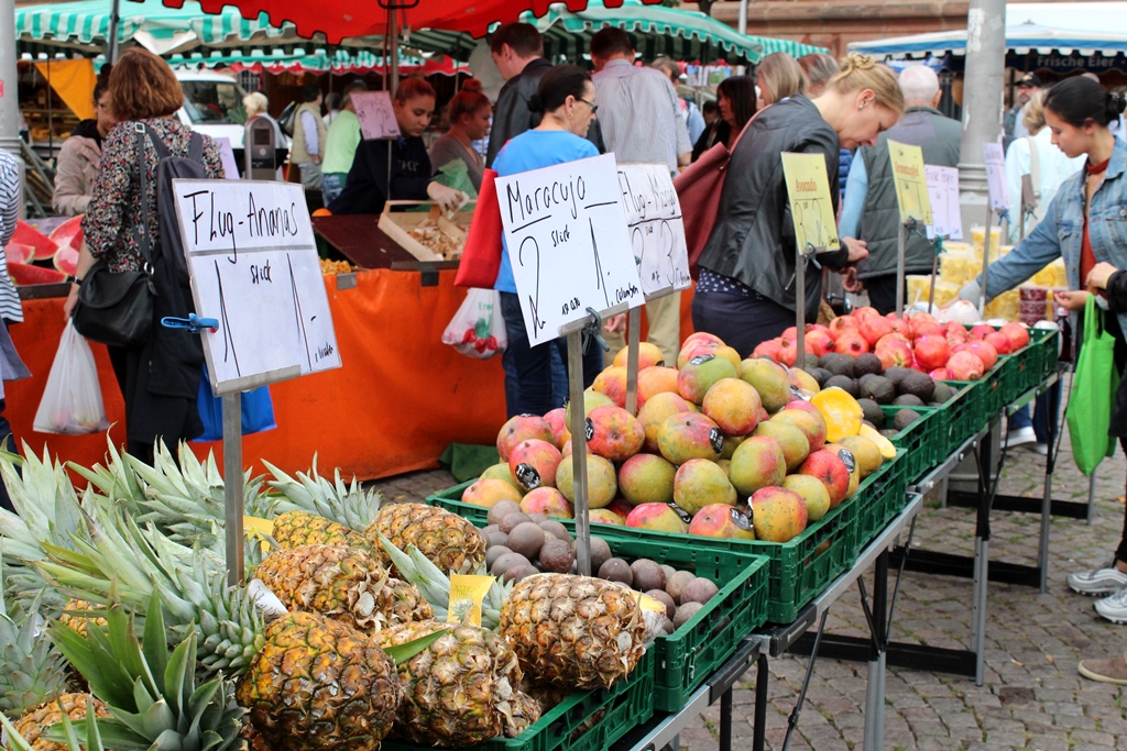 At the Marktplatz in front of the Rathaus, since early morning till lunch time, there is always a farmers’ market opened. The stands are really pretty with colourful umbrellas. You can buy there fresh food: meat, fish, fruit, vegetables. They offer huge variety of cheese, exotic fruit, and local products like wine or honey. There are also seasonal flowers and house decorations. If you get hungry you can always get a warm sausage (curry wurst) and fries. All of it in the rhythms of music played by local artists – violin, cello, accordion.